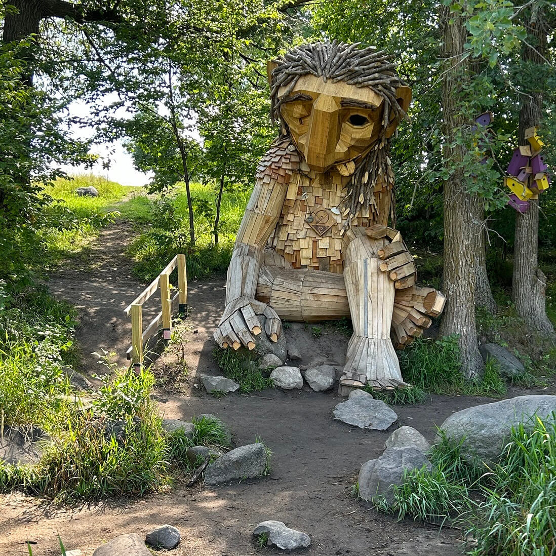 If you are a gamer, outdoor enthusiast, or fan of fairy tales, you will appreciate visiting the giant trolls in Detroit Lakes (DL). The storyline here is a slight twist to a version of Alice in Wonderland. Thomas Dambo, the curator, spins a folk tale about one of the giant trolls, Alexa Elixer. Who breaks a curse that binds humans. Hearing the story of the five trolls and the rabbit, all made from recycled materials, piqued my curiosity to revisit DL. Marcy joined me on the trip and was primarily excited about this area’s biking, hiking, and paddling opportunities. But after seeing the first troll, Alexa’s story grabbed her attention, and she was hooked. She found these magnificent troll creatures in a land of 412 lakes inspiring. Especially after seeing the Golden Rabbit, it was like a shot of happiness straight to your brain. Enjoy the adventure!
