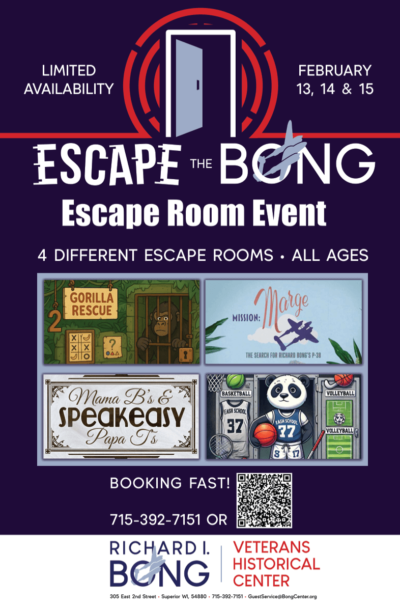 The Richard I. Bong Veterans Historical Center is hosting Escape the Bong VIII (8), from February 13 to 15. Escape the Bong 8 is a three- day event that features multiple escape rooms that will test your deduction and puzzle-solving skills. Each room is designed for an hour of problem-solving fun along with a unique...